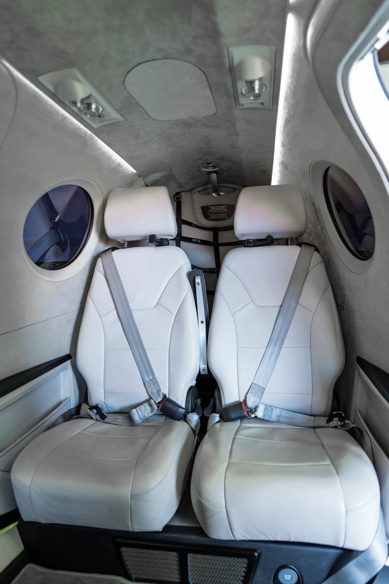 The six-place interior features reclining leather seating, ambient lighting, and photovoltaic dimming windows, offering a clean and comfortable cabin environment.